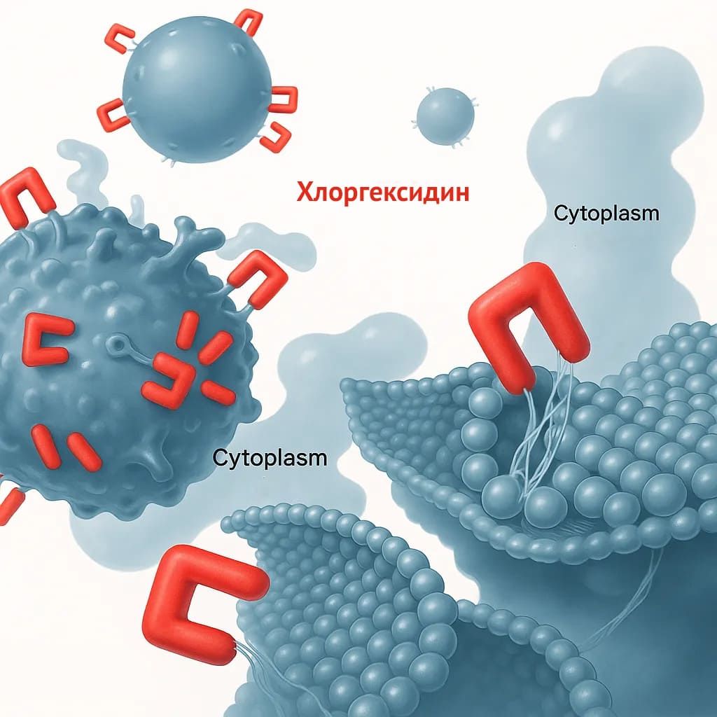 Механизм действия: катионный бигуанид взаимодействует с клеточной мембраной микроорганизмов, вызывает её разрушение, нарушение проницаемости и гибель клетки. Эффективен против грамположительных и грамотрицательных бактерий, обладает умеренной активностью в отношении некоторых грибов; неэффективен против спор.